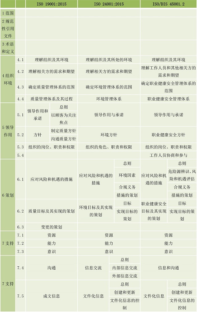 在國內(nèi),組織都是將各個管理體系進(jìn)行整合,質(zhì)量、環(huán)境、職業(yè)健康安全管理體系作為ISO標(biāo)準(zhǔn),均使用了高階結(jié)構(gòu),為體系的整合提供了便利。表2將三個體系的框架進(jìn)行了對應(yīng)于合并,可供讀者參考。